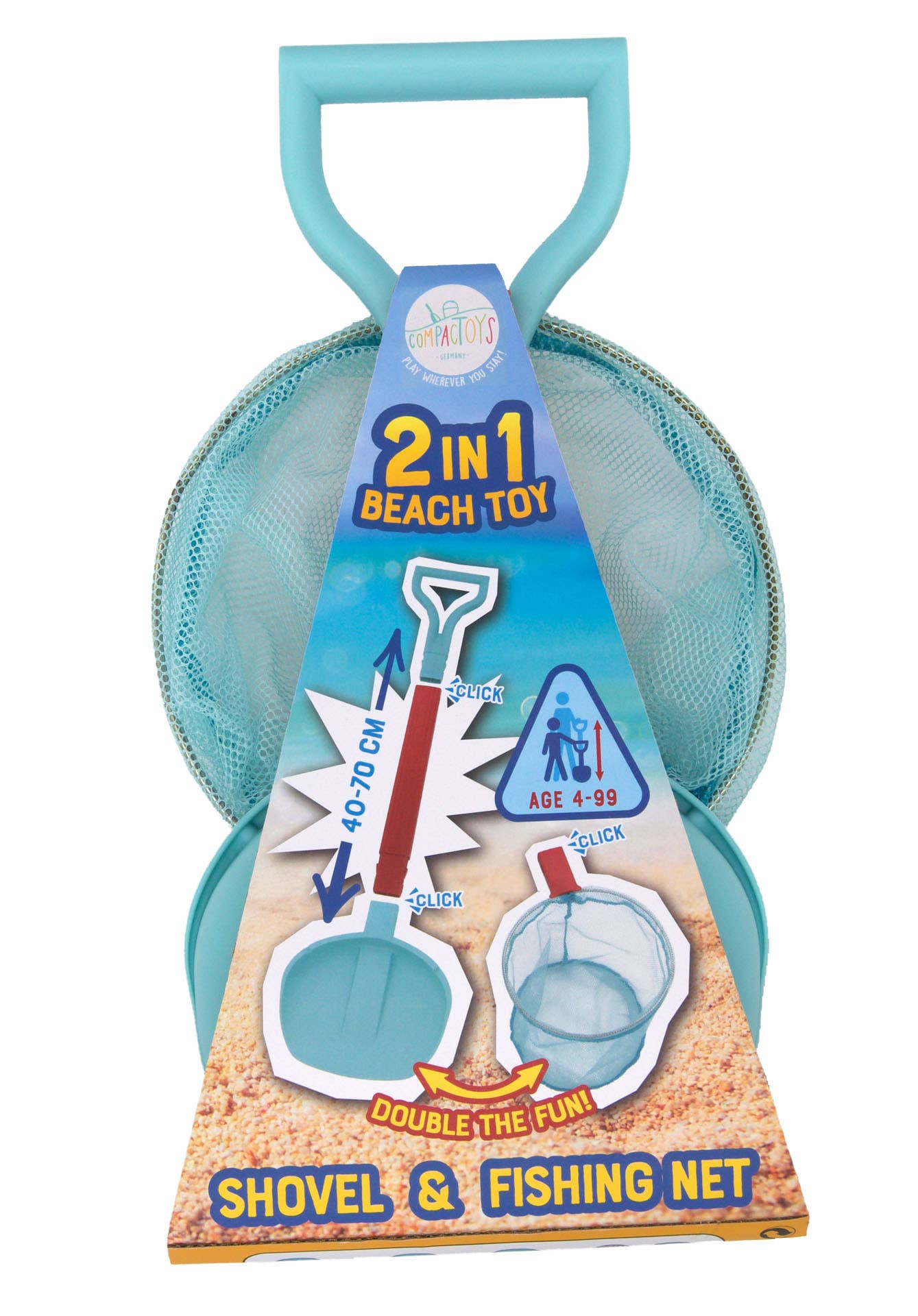 The 2 in 1 Beach Toy set offers space saving fun for adventures on the shore. Enjoy a large shovel and robust fishing net, ideal for digging in the sand and playing in the water. Either the shovel or the landing net can reach a length of 28 inches. Both can be used simultaneously if one is a shorter version.