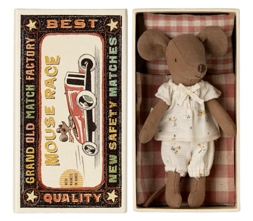 A classic Maileg item. This mouse is ready for hours of play and sleeps tight in the matchbox. The clothes and bed linen come in unique prints and beautiful colours.
