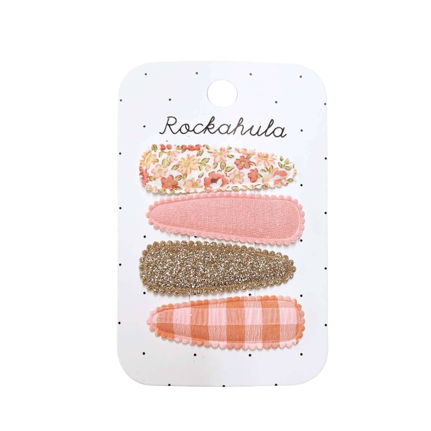 Mix and match this lovely pack of four clips, featuring our Margot floral print, a glittery gold fabric, our bright gingham print, and a soft coral fabric. Wear them one at a time, or all at once!