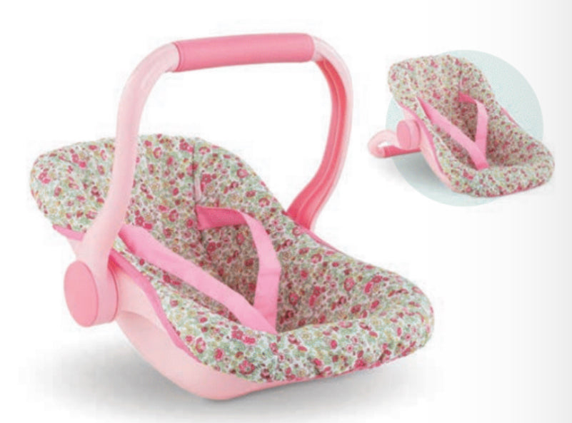 Lightweight yet sturdy and styled like those for real babies, it features security straps and a handle that adjusts to three different positions.