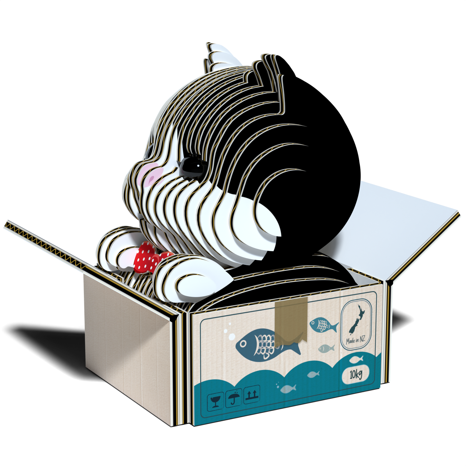 EUGY - a super-fun 3D puzzle that's eco-friendly and can be assembled in 10 to 20 minutes! This collectable toy is great for STEM concepts and craftable fun. With black and white fur, it's no wonder this kitty's name is Tuxedo! With a precious pink nose and little red bow tie, you can't help but forgive Tuxedo for getting into the fish box! A perfect arts and craft activity to help pass some time and teach following instructions.