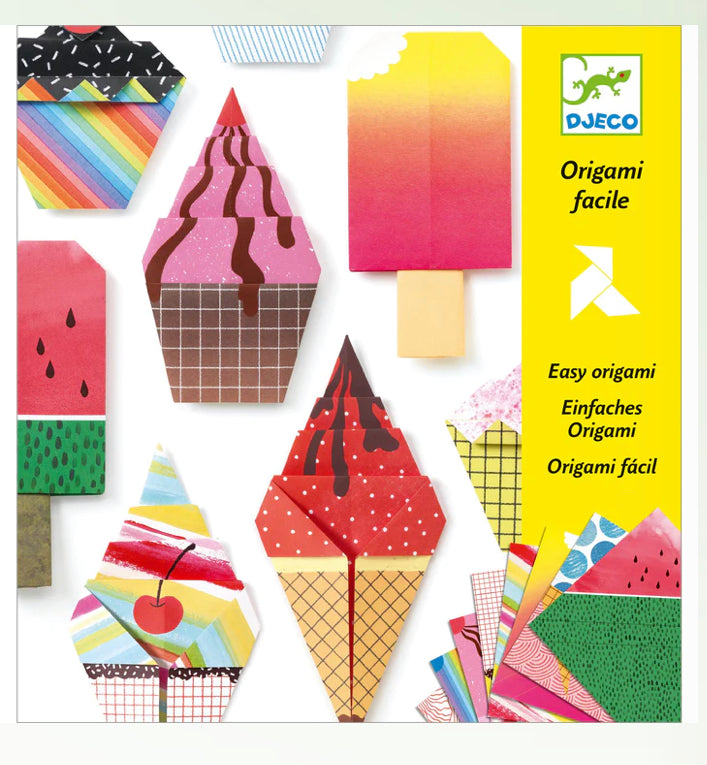 An origami set for foodies! Following the instructions in the booklet and the marked lines, children fold the illustrated sheets to create 24 appetizing paper desserts — ice creams, cupcakes, and muffins!