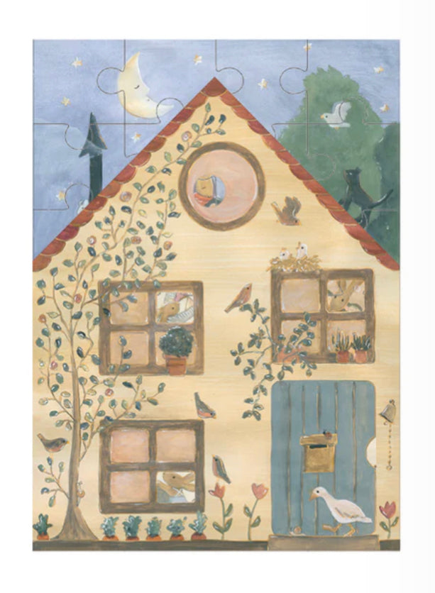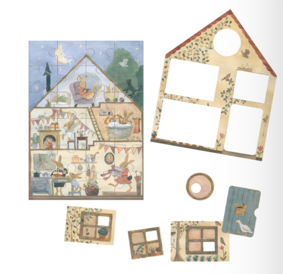 Puzzle-game to tell and invent stories. Assemble the 24 pieces of the puzzle, put the front of the house on top and complete with the door and windows. Do you see the little heads behind the windows? It's party time in the rabbit house!
