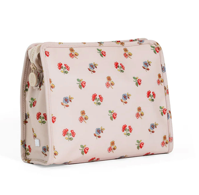 Our best-selling Roadies are our BFF's in the pouch world. Available in 3 sizes, our Roadie is made in a cotton floral print with a thin eco-friendly matte coating, an inside slip pocket and exterior snap open zip tabs for a wider opening and an easier access. These make amazing baby shower gifts! Add personalization with a monogram or name embroidery.
