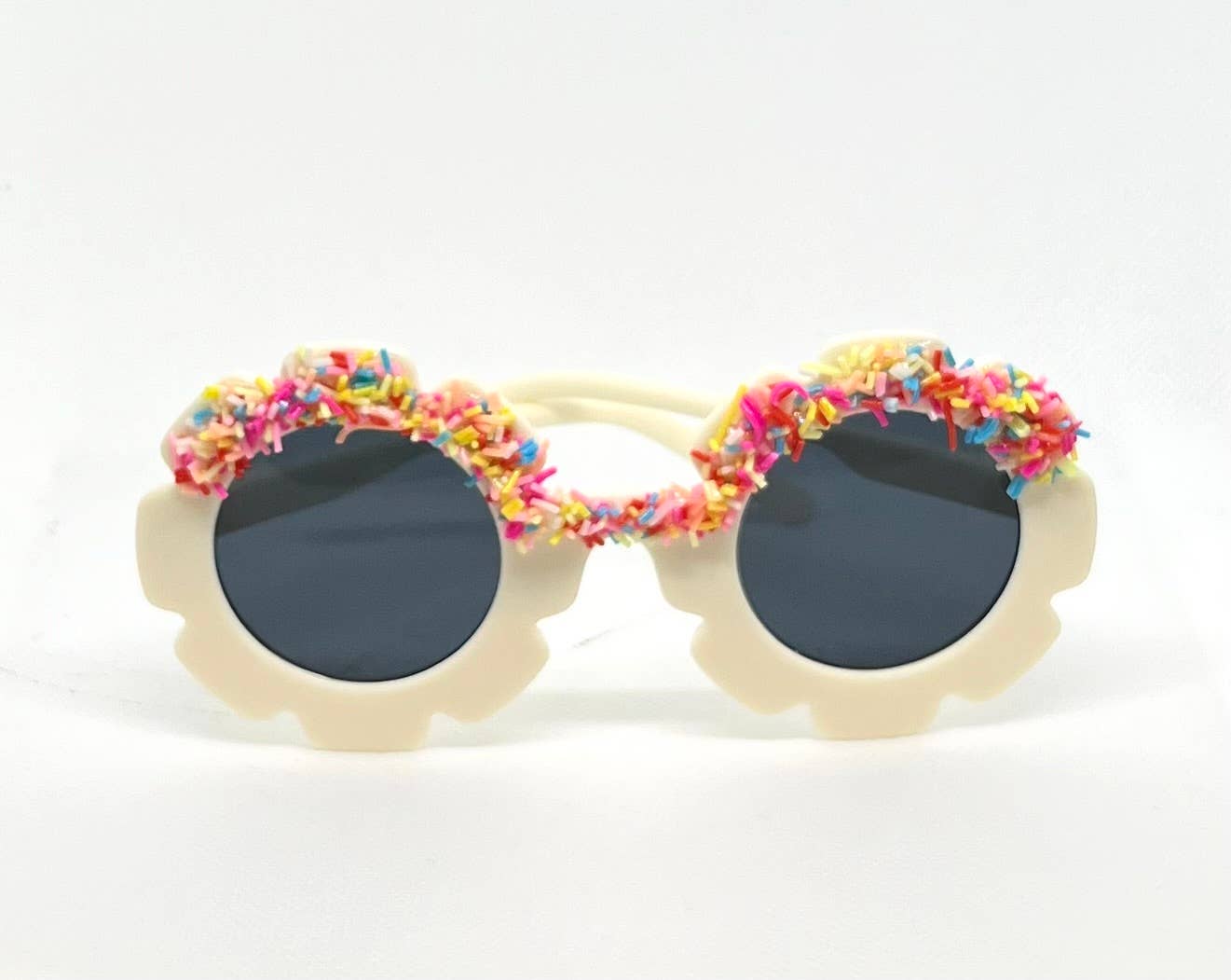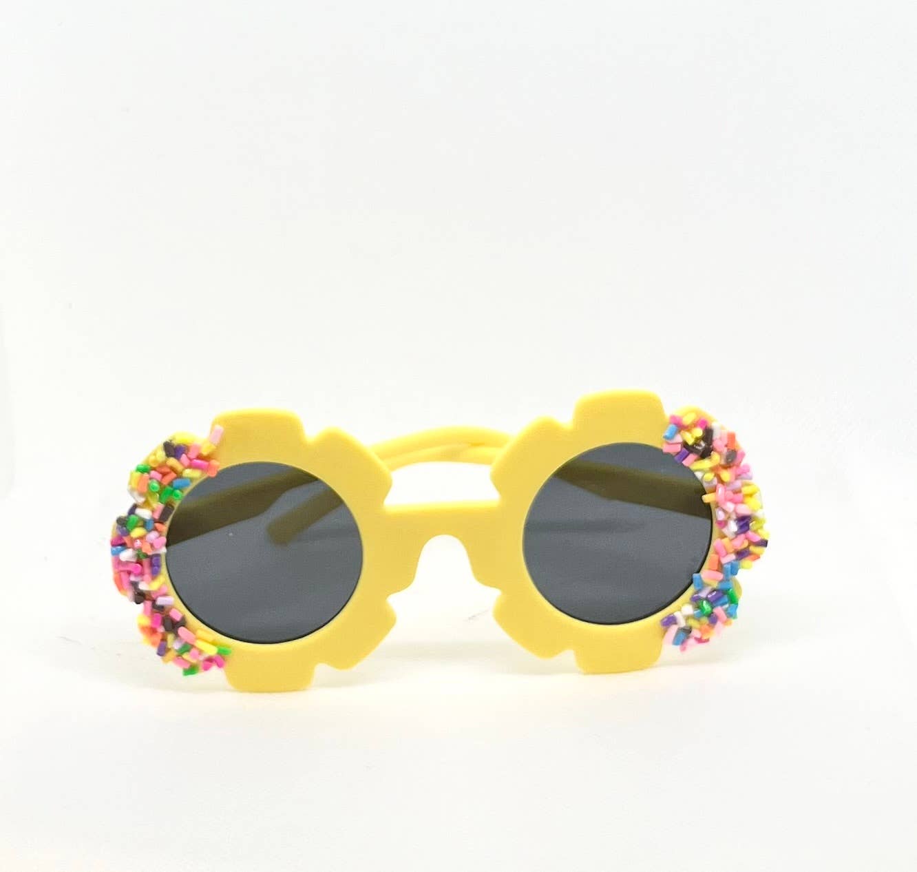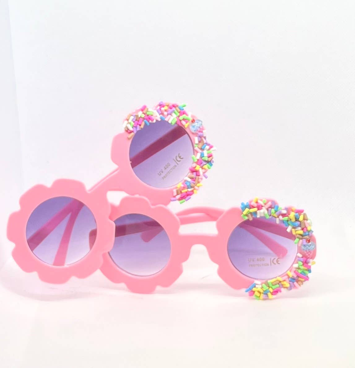 The total width of the flower sunglasses for girls is about 5.11 inches, frame width and height are 1.53 inches, nose width 0.74 inches, leg length 5.31 inches, toddler sunglasses, suitable for children over 2 years old Light to wear: these round shape sunglasses are flat and sturdy, made of quality AC and PC material, which is skin friendly, smooth, and not easy to break, the kids retro sunglasses will not add too much burden to their nose bridge. All sprinkles are attached with translucent industrial glue - small pieces are a choking kids under 3 UV400