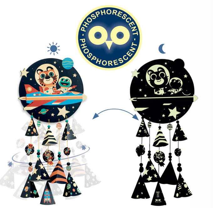 Create a fluorescent space-themed chime from bells, wooden beads, and illustrated cones strung on waxed cotton threads. When you move the threads, the chime tones pleasantly and, in the dark, it lights up!