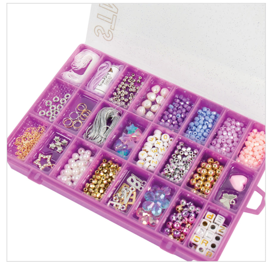 Crafty teens and tweens design party-worthy jewelry, to wear or share, with over glitzy 500 beads and charms in this neatly organized kit! Spell out a name or design a custom piece to wear with the various metallic, pearlescent, and letter beads, and embellish it with seed beads and charms. Kit includes enough fixings to create more than 15 unique pieces of jewelry, and includes sparkly reusable storage case.