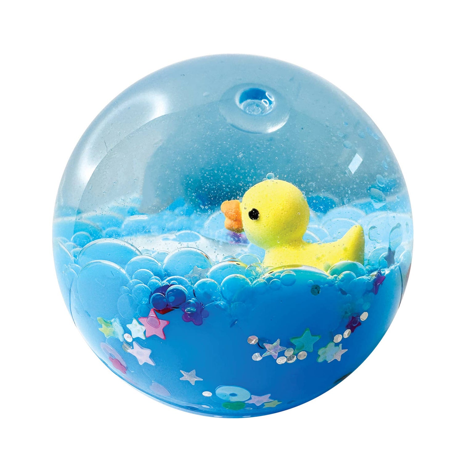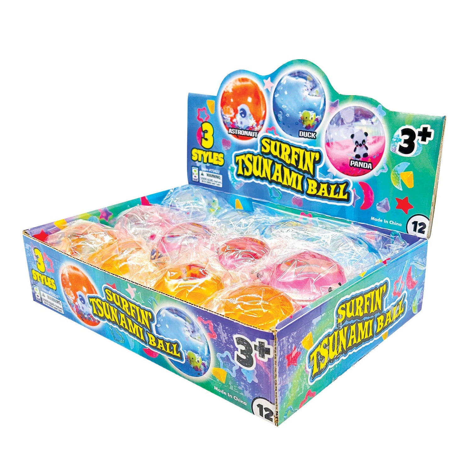 A tsunami of fun at your finger tips! Oil & water mixture with small figure and lots of glitter fill each bouncing ball. 3 styles: panda figure with pink liquid, ducky figure with blue liquid, and astronaut figure with orange liquid. Tiny figure and glitter inside each ball ride the waves when you spin and bounce.