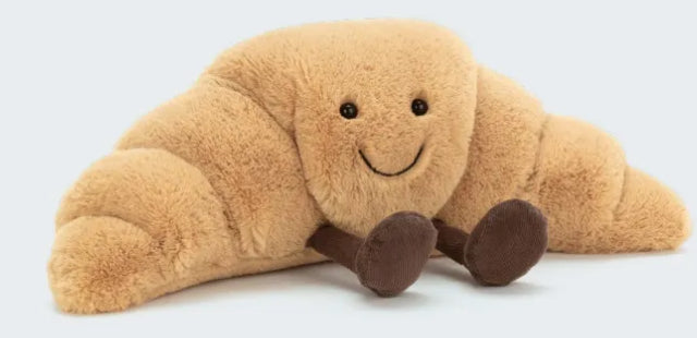 Bonjour, mes amis! Un petit dejeuner? Amuseable Croissant is a crusty cutie - all golden and fluffy with soft pastry knobbles. This delightful scamp has a big sunny smile and cordy boots au chocolat! Rise and shine with a cuddly croissant.