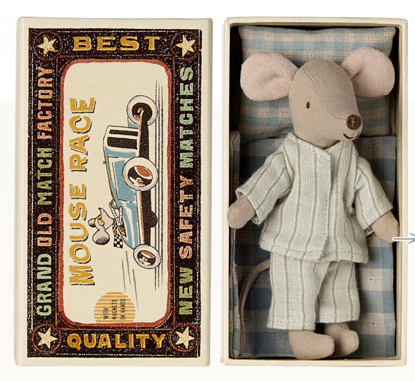A classic Maileg item. This mouse is ready for hours of play and sleeps tight in the little matchbox. The clothes and bedlinen are made of soft fabrics with unique prints in beautiful colors. Extend the story by adding accessories to the play
