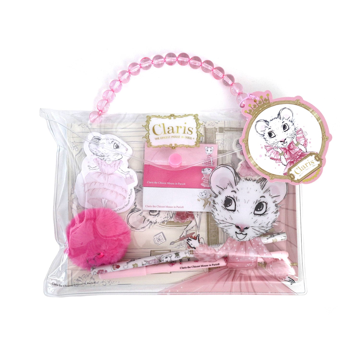 Tres chic! This stylish stationery set contains all of the essentials you need to get organized, Claris style! Packaged in a clear plastic wallet with button closure and beautiful pink beaded handle, this set includes a pom pom pen, pencil, 2x sticky notes sets, paperclips, an eraser and an A5 exercise book, each adorned with elegant Claris illustrations, sure to delight fans young and old!