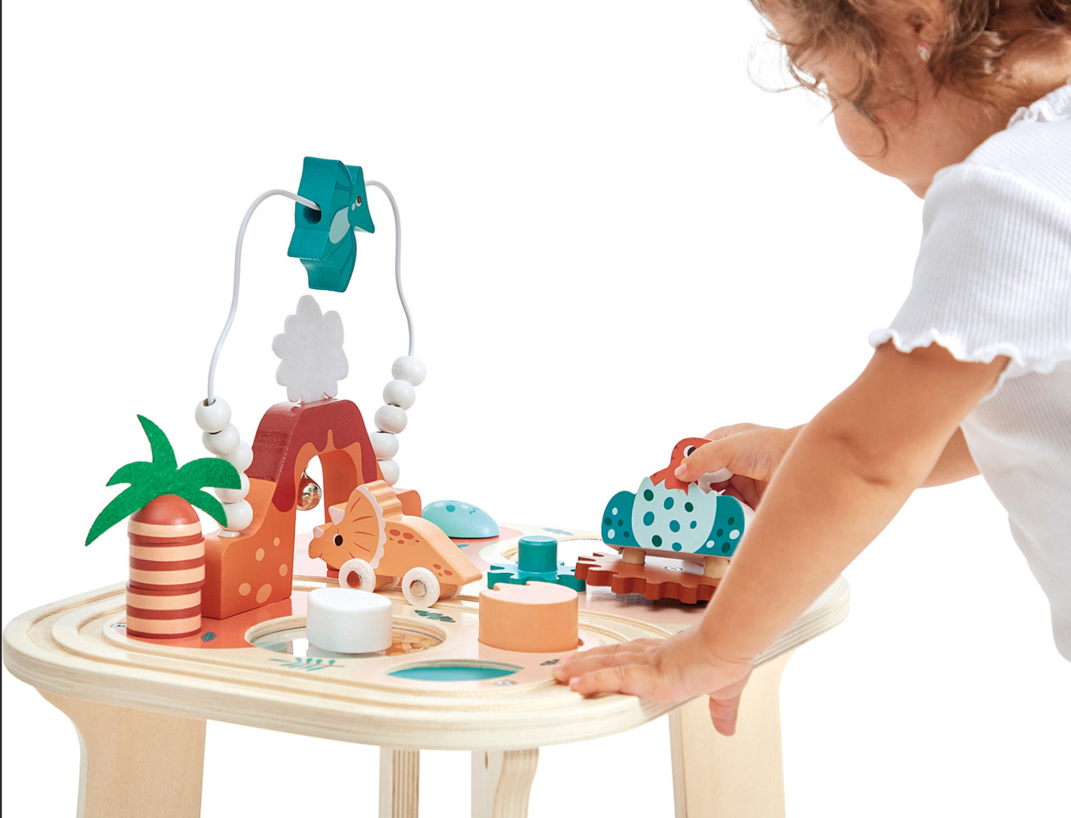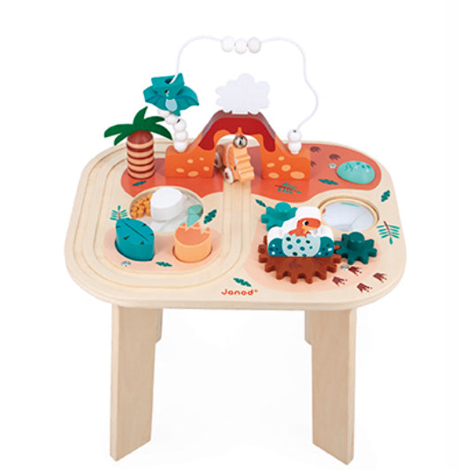 Young dino fans explore a land of long ago with this durable wooden activity table! Packed with activities, toddlers are entranced as they discover cause and effect and experiment with sound and motion. They'll push the Triceratops around the track to hit the bell, slide the beads and Pterodactyl over the volcano, twist the dino egg to move the gears, stack the palm tree pieces, flip the mirror, and more!
