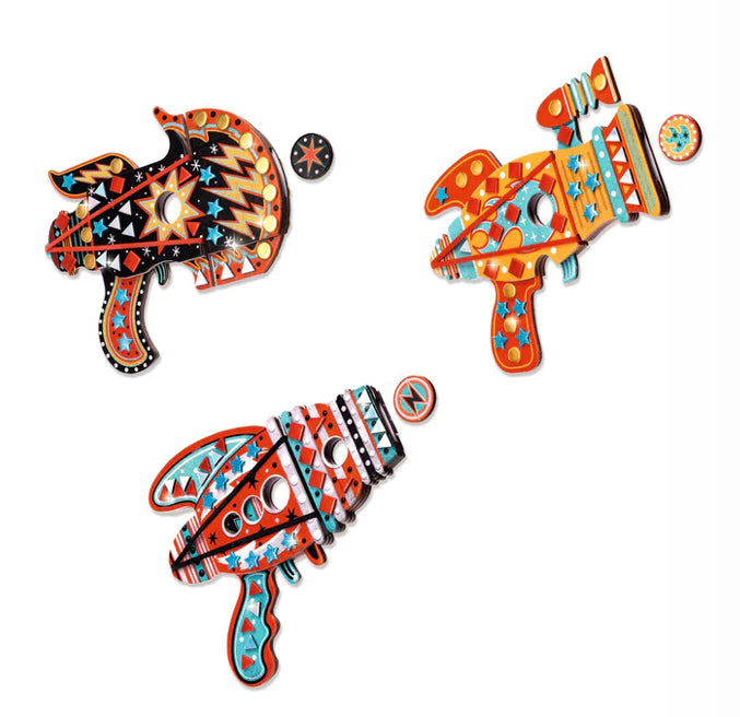 Get creative and decorate three launchers with mosaic stickers. Children place the stickers according to the numbers on the launchers. Once all three are finished, all you have to do is head off to conquer the galaxy!