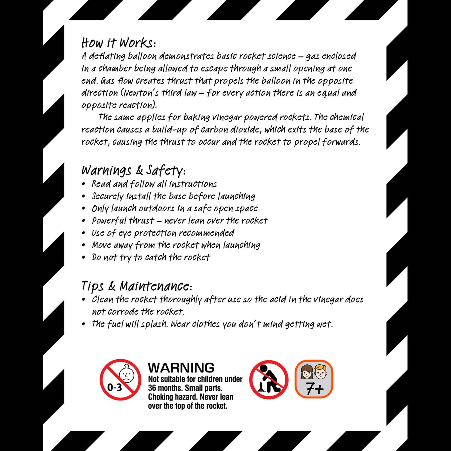 This mini rocket can be launched again and again with the explosive power of bicarb and vinegar. The Fizz Rocket is filled with these 2 household items which create a chemical reaction that makes a build-up of carbon dioxide which shoots out the base of the rocket and shoots the rocket up.