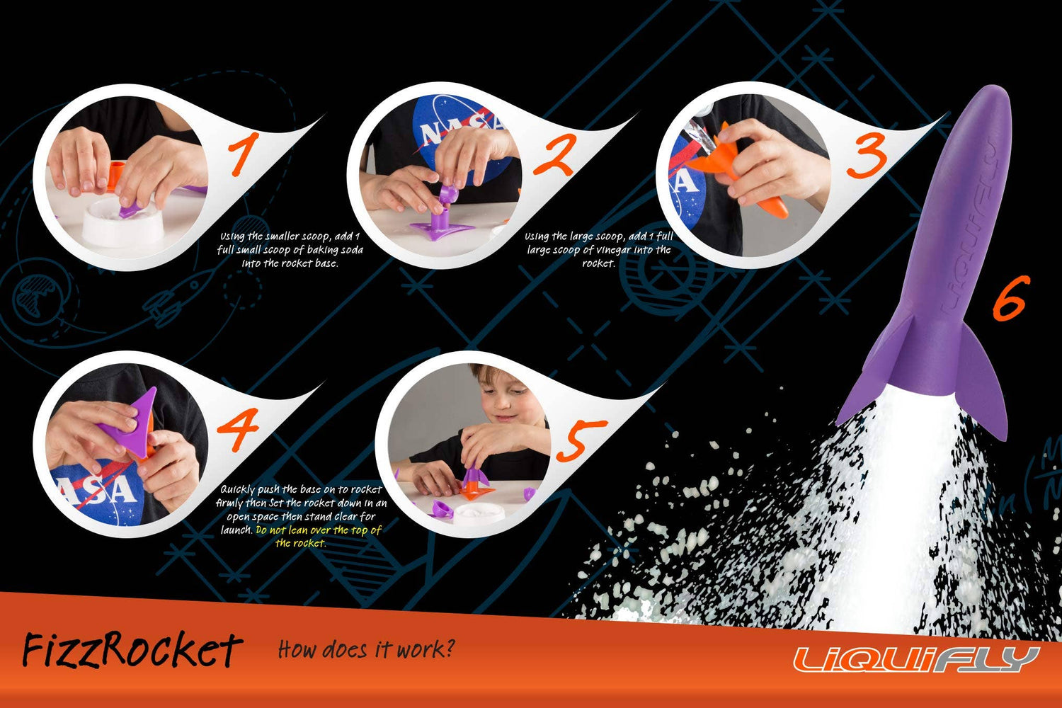Simply put 1 small scoop (included) full of bicarb soda into the rocket base, add a large scoop (included) of vinegar into the base, clip the rocket onto the base then place it on the group and wait for lift-off!