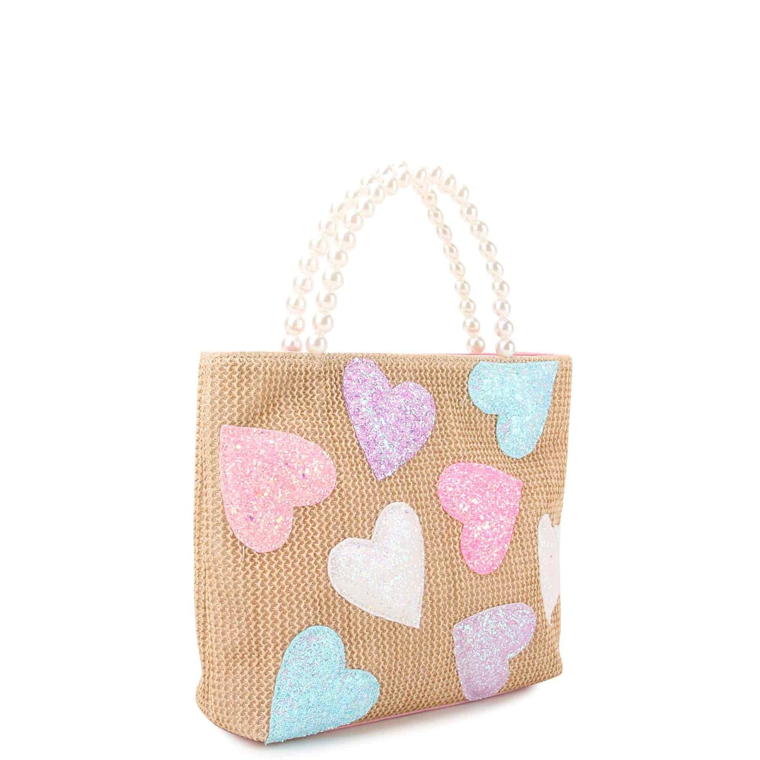 Heart-Patched Straw Mini Tote Bag with Pearl Handles