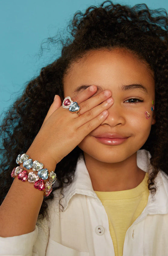 Wear your heart on your sleeve… or rather, your wrist and fingers! This set is all about showing off your big love with big, heart-shaped gems. The set comes with two bracelets and two rings—one set is pink and the other is blue. Perfect for sharing with a super friend or stacking them all for a doubly delicious look. We think you’ve got a heart of sparkles!