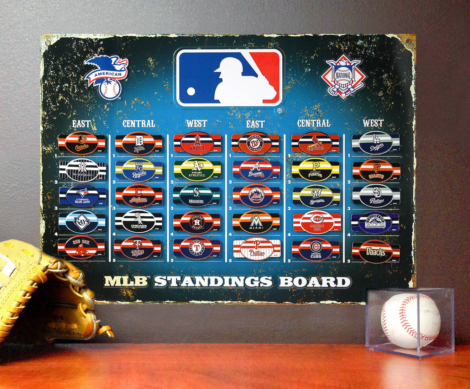 Keep track of the official MLB team standings with this magnetic standings board! Each standings board includes all 30 MLB team magnetic tin labels and features a realistic weathered design and embossed lettering. The standings board is made of heavy-guage steel and is drilled and riveted for easy hanging on any wall. This item is perfect for any bar, office, or fan cave! Dimensions: 13.5Ó x 18.5Ó Officially licensed.