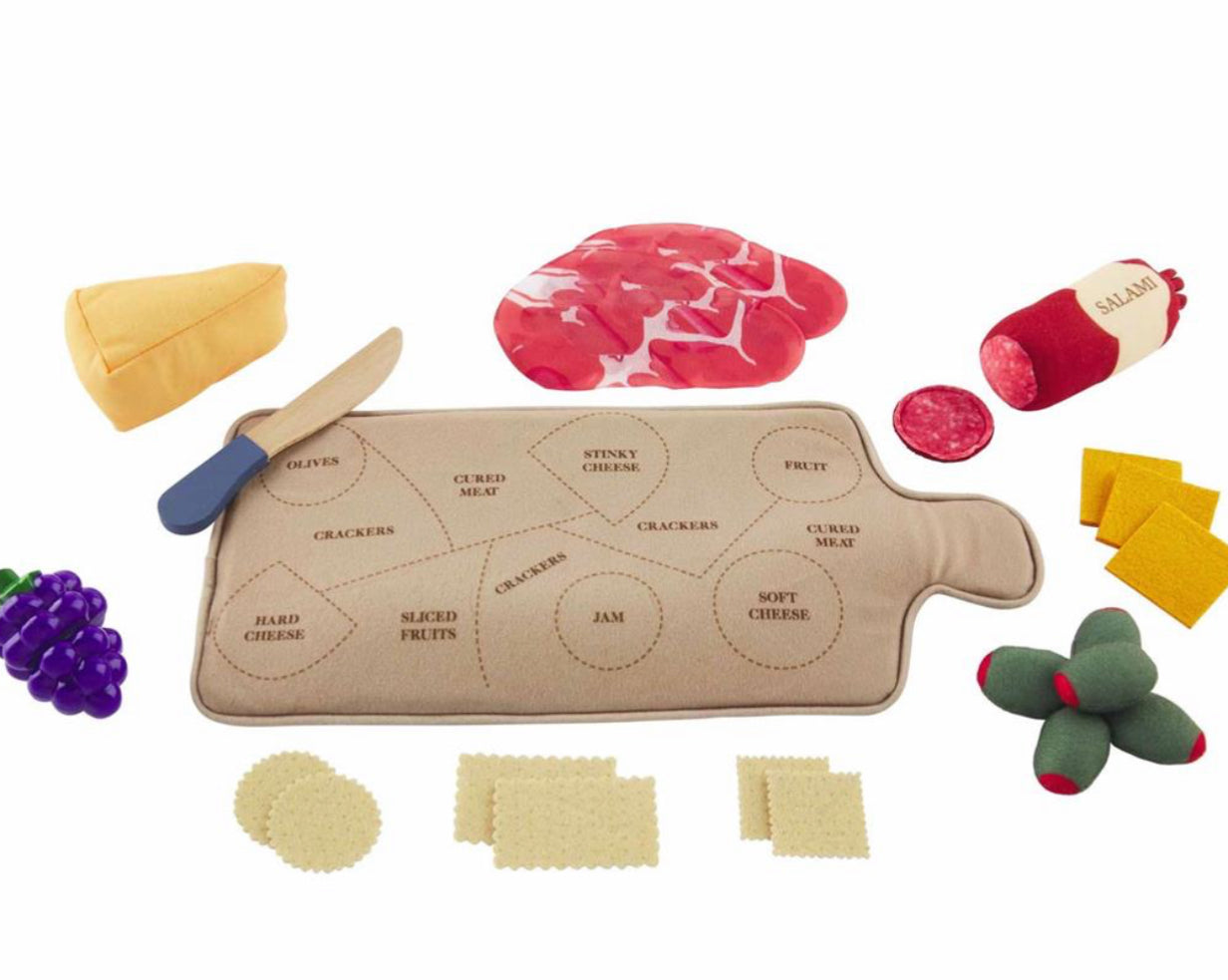 18-piece set. Play charcuterie board comes with 6 felt crackers, felt olive bunch, plush cheese, grapes, plush salami, wood knife, 3 felt slices of cheese and 2 pieces of prosciutto. Ages 3+.