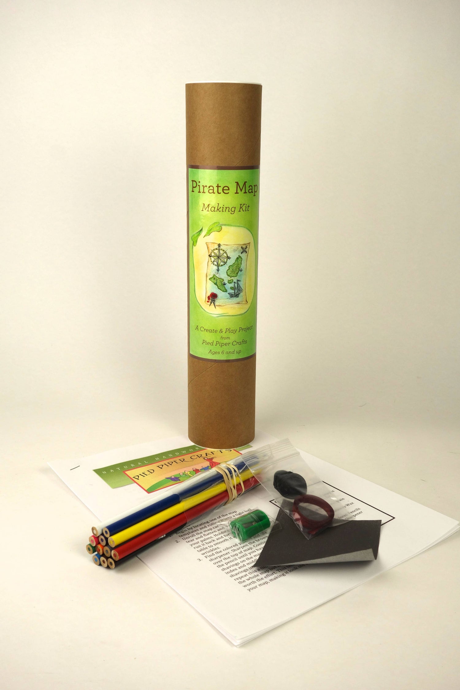 Colored pencils and sharpener included. (2 map templates, sample images, colored pencils, pencil sharpener, 2 skull & cross bones wax seals, ribbon all included.)