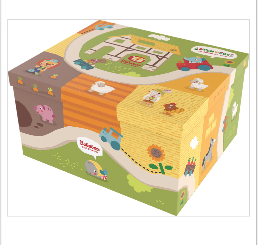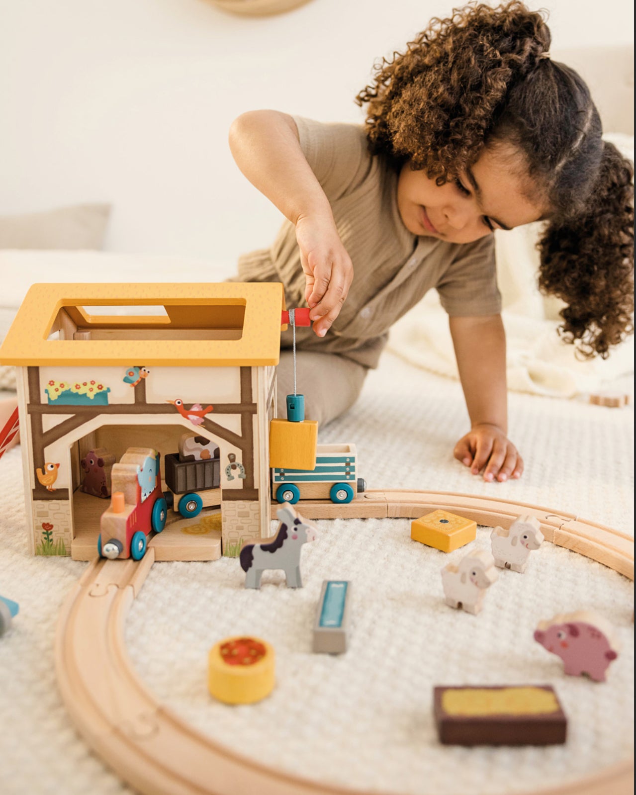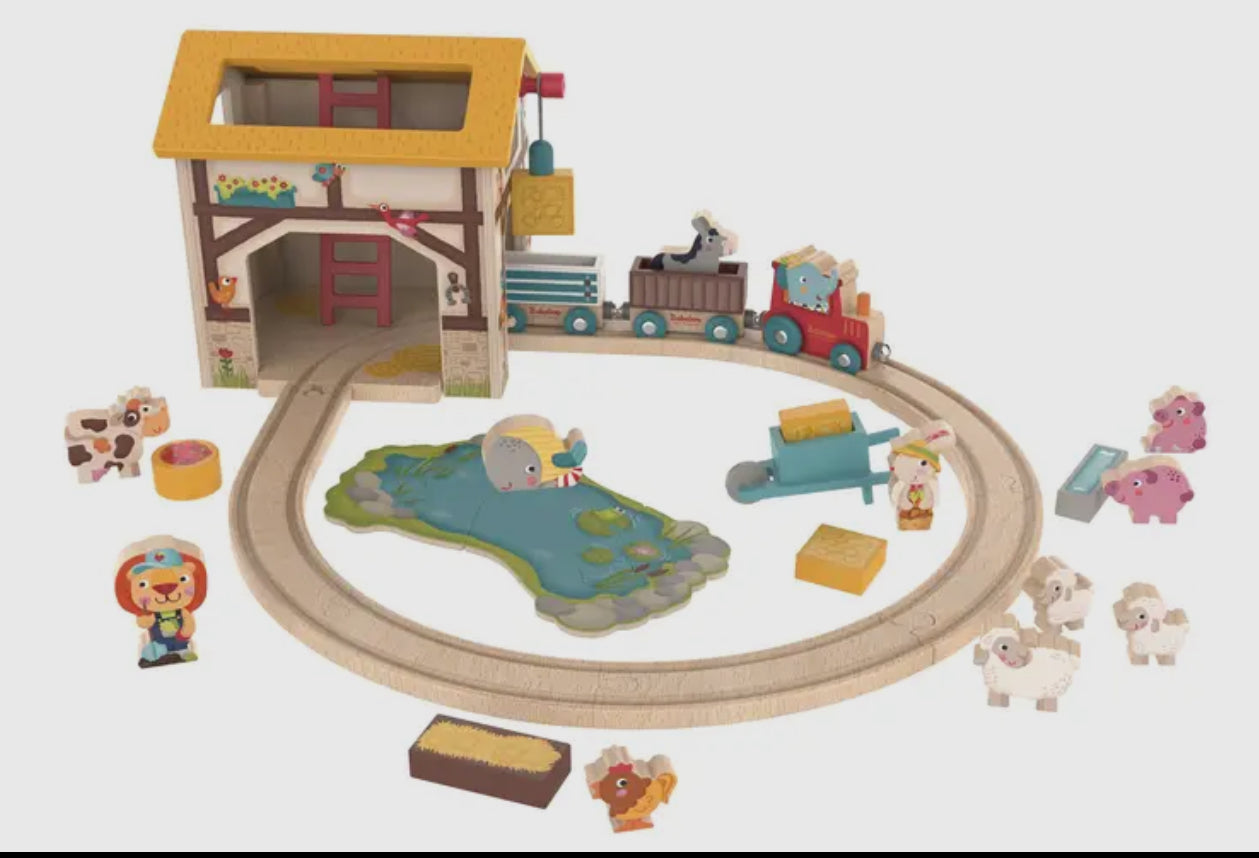 Welcome to the world of Bababoo and friends! Your toddler will discover hours of imaginative play and storytelling with this high quality wooden playset. The adorable Bababoo animal figures can take rides on the 3-car farm train, have a snack on top of hay bales, climb the ladder into the barn loft, or take turns pushing the wheelbarrow to the pond! Packaged in a beautifully designed box, it's an heirloom quality playset that promotes creativity, hand-eye coordination, and spatial understanding.
