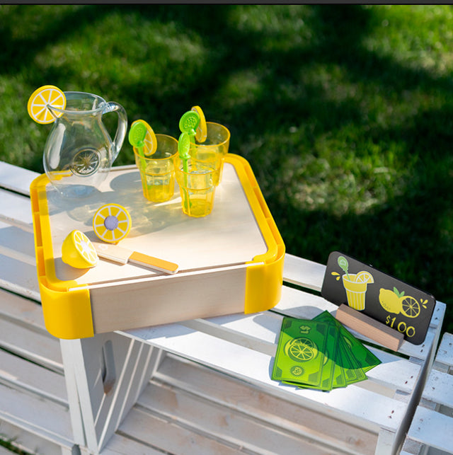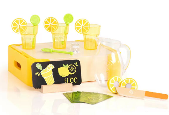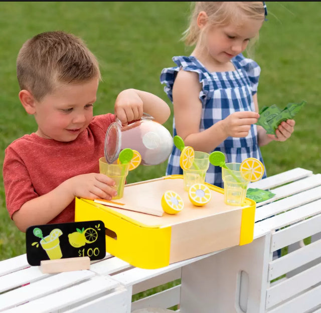 No need for a Rockwellian neighborhood street corner. Kids can set up the perfect lemonade stand right in the playroom! There's a hook-and-loop lemon to cut in half, a pitcher, pretend ice cubes that are crystal clear, a set of three glasses, lemon slices that fit onto the glasses, stir sticks, a chalkboard sign, and of course, money. Plus, the storage crate doubles as the perfect display table! Inspire pretend play that's so fresh and so sweet with the Pretendables Lemonade Time Set.