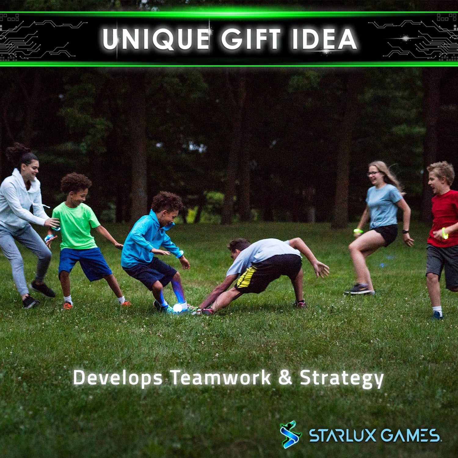 The backyard classic now glows! Players of all ages join together, form strategies, guard, chase, hide and sprint! This game has won half a dozen awards and been featured in nearly 100 media outlets, including Buzzfeed and The Today Show. Includes 25 light up, reusable game pieces (batteries included). For 4-8 players (or 8-16+ players with game variations), ages 8+