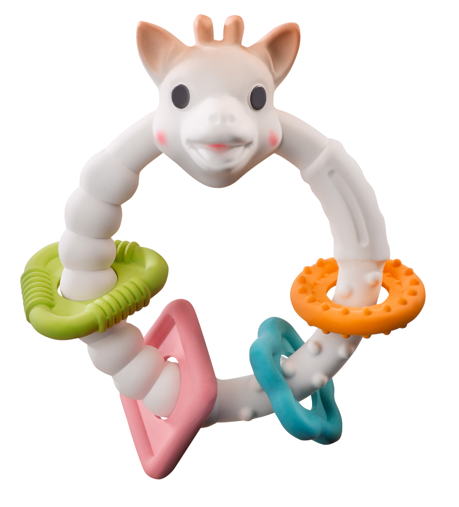 Teething Colo'rings - Healthy and natural, this teething ring is made of 100% natural rubber, pulled from the Heavea tree latex, and food-grade paints. With numerous soft parts to chew and with various textures (Sophie’s spot, ridges, ears and horns), it offers different massages and relieves efficiently Baby’s sore gums.