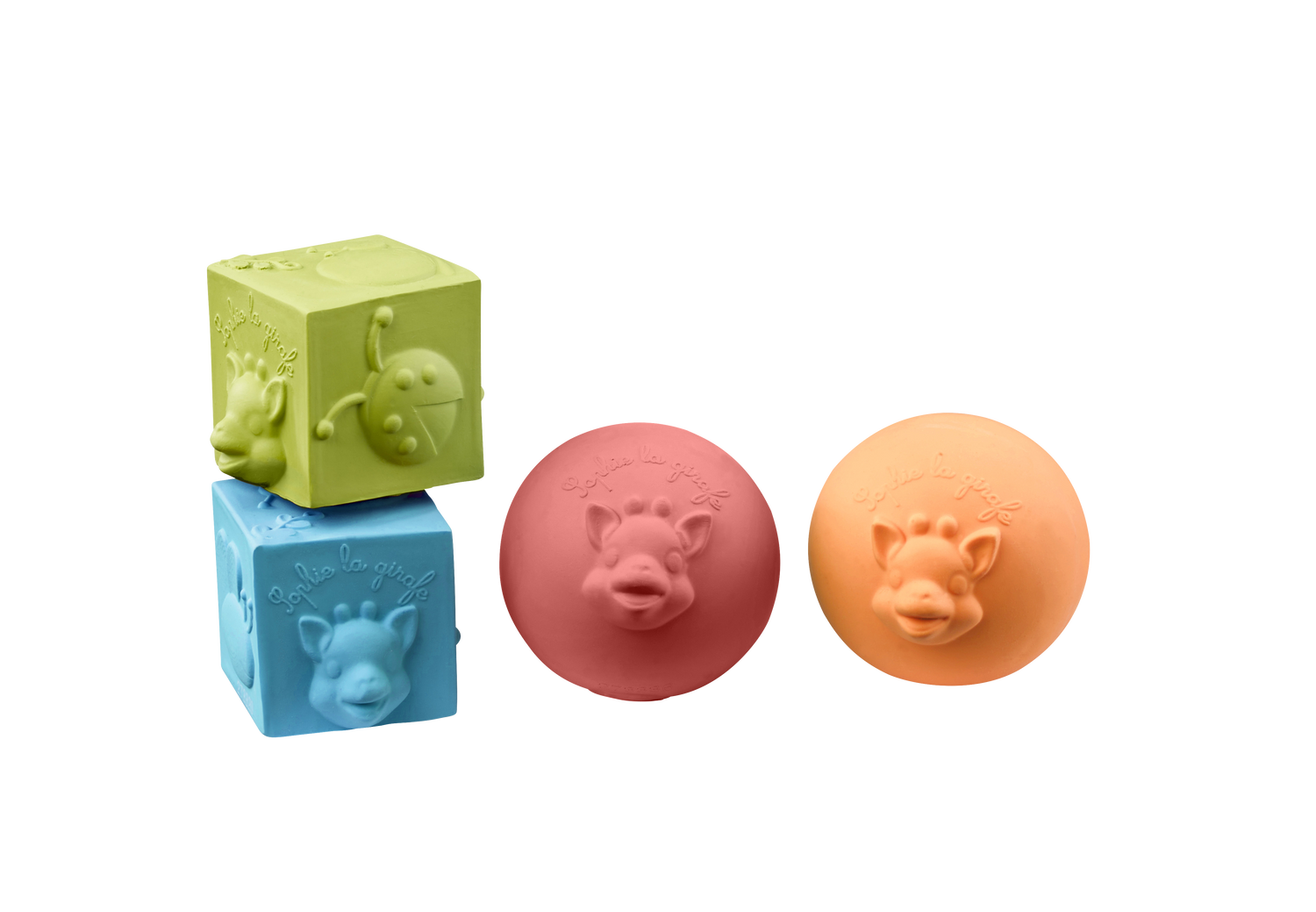 2 balls and 2 cubes - Baby develops his motor function while manipulating the cubes and balls, catching or throwing them. Baby discovers on each cubes and balls deferent embossed design to vary touch sensations and sour