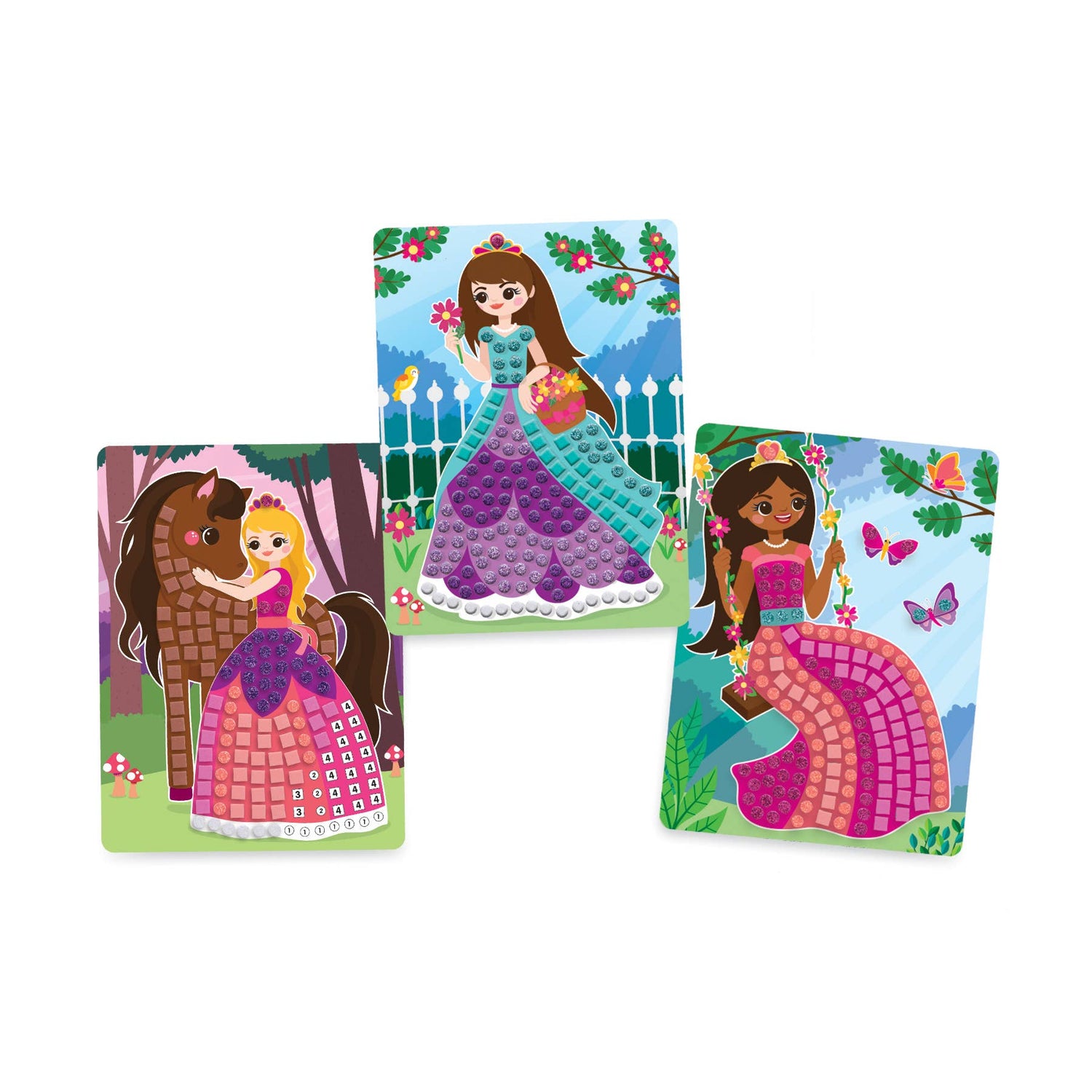 Sticky Mosaics® Travel Pack - Princesses is the perfect activity kit for on-the-go fun. This mini-sized craft set comes with three unique designs and easy-to-follow instructions. Add glittering pieces and tiles to a numbered template and create your own mosaic masterpiece! It's simple, convenient, mess-free play.