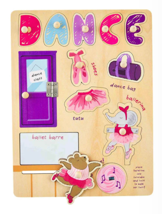 Wooden puzzle with knob handles features hinged, mirrored and spinning details for pretend play. Ages 3+