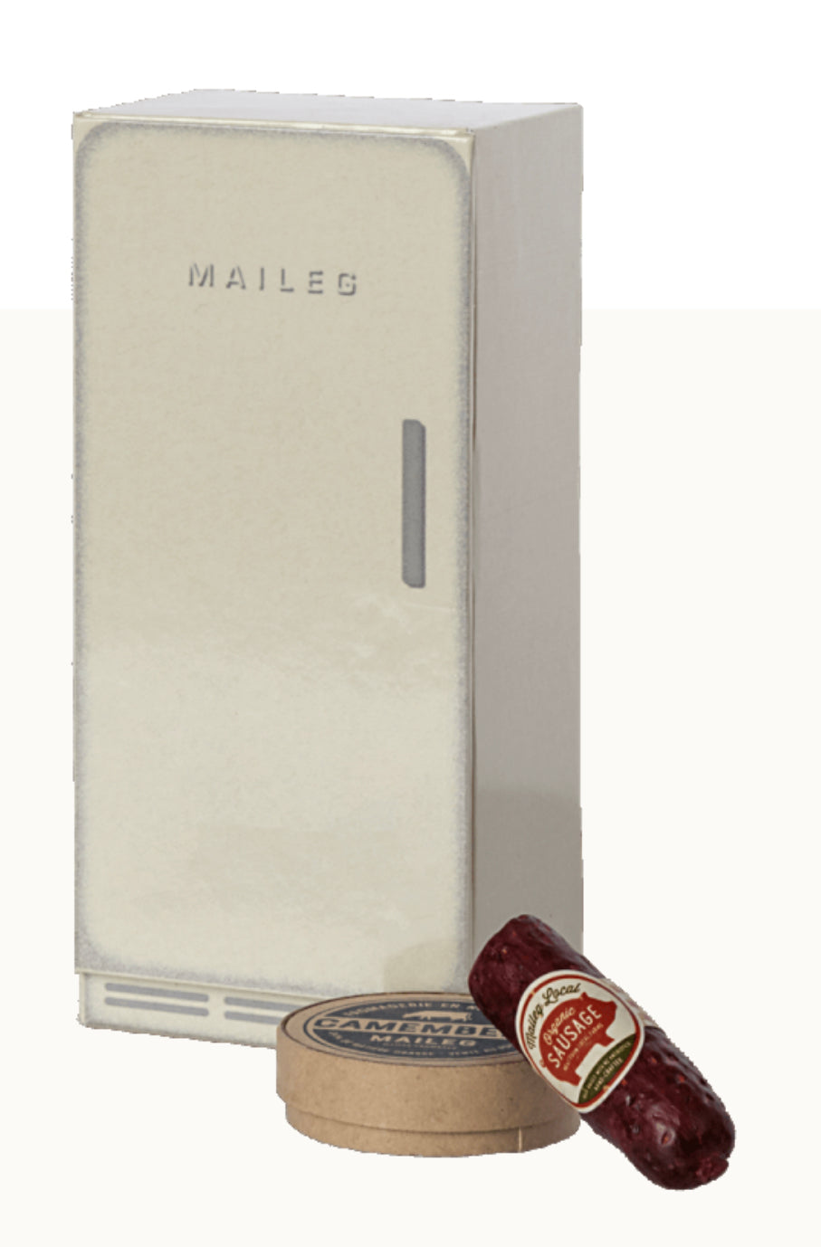 The perfect place to store your groceries so they stay fresh and cold. Inside the cooler, you find a small sausage and cheese. The cooler is made of cardboard and fits perfectly into the mouse castle kitchen .