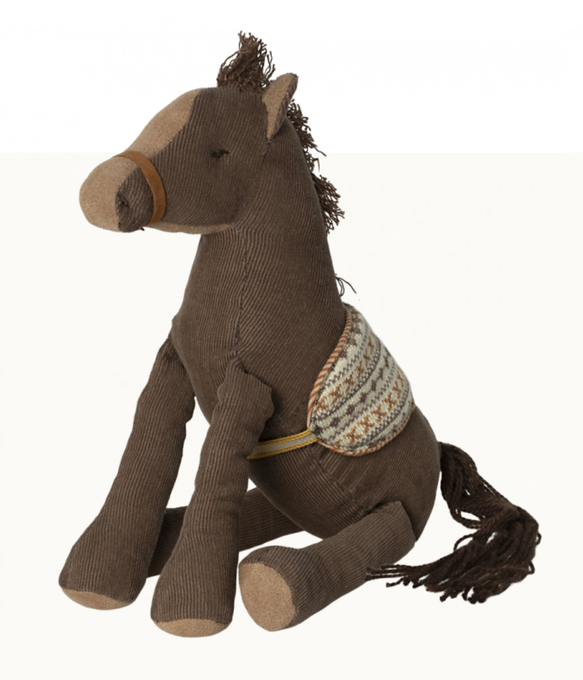 The brown pony is made of beautiful soft corduroy and has a saddle on its back. Ready to start the ride?