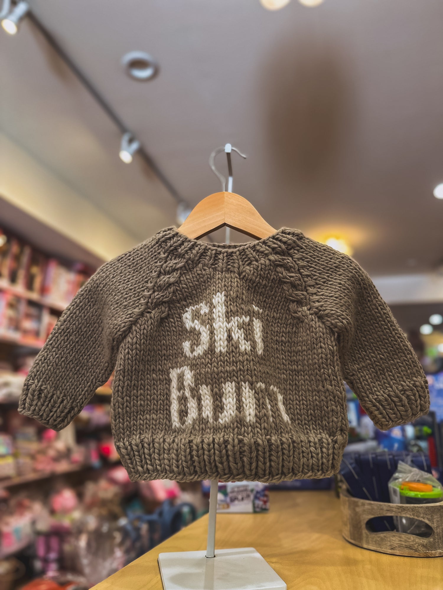 What a fun sweater for your little aspiring skier! Hand-knit in chunky yarn, this crew neck sweater in Pebble says 'ski bum' across the front in Natural yarn. Hand knit, it is soft and warm. This is such a great gender neutral sweater, perfect for any little person. Make sure you buy the matching ski bum hat to go with this. Our sweaters are partially knit from recycled, sustainable Polyester yarn made from plastic bottles. We are on a mission to help reduce the world's plastic pollution problem ♻ • Hand Knit • 60% Acrylic, 40% Recycled Polyester • Hand Wash
